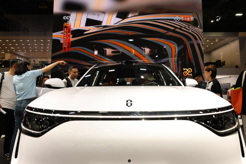 5月1日,参观者在第二十一届上海国际汽车工业展览会上的一辆问界M8展车旁交流。新华社记者方喆摄