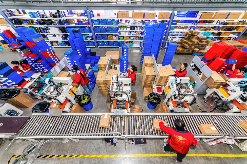 2025年4月20日,在位于浙江省温州市的德赛集团物流园内,工作人员在对发货鞋类产品进行分拣、打包。新华社发(刘吉利摄)
