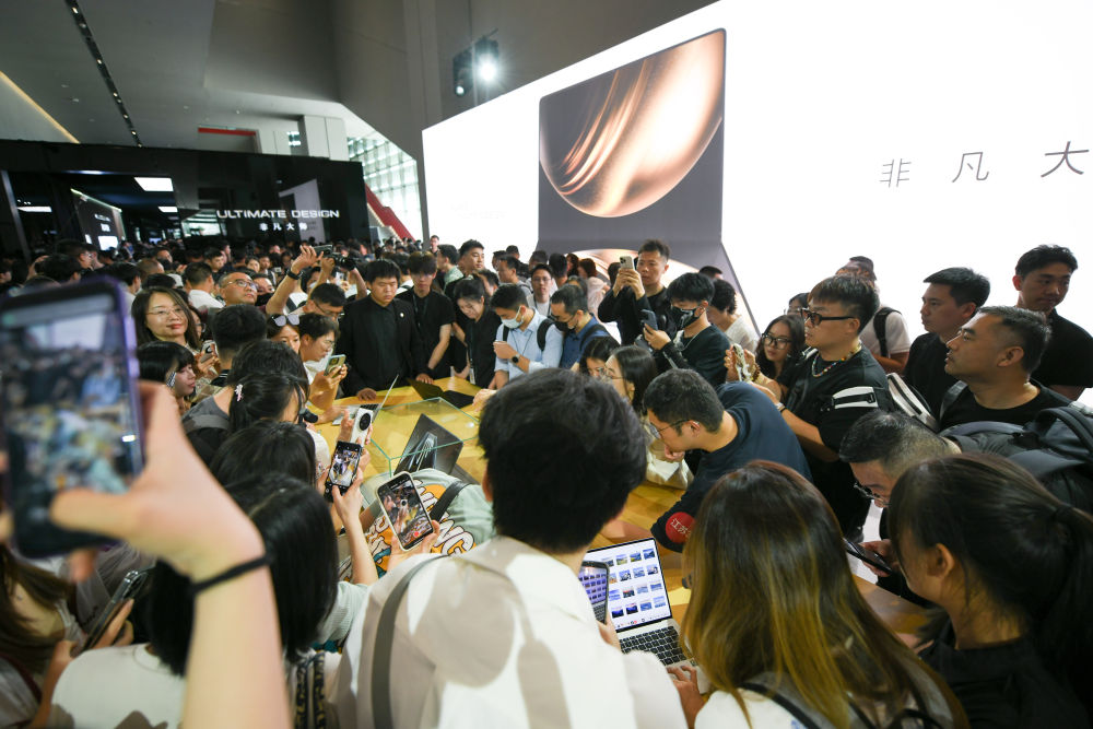 5月1日,参观者在第二十一届上海国际汽车工业展览会上的一辆问界M8展车旁交流。新华社记者方喆摄